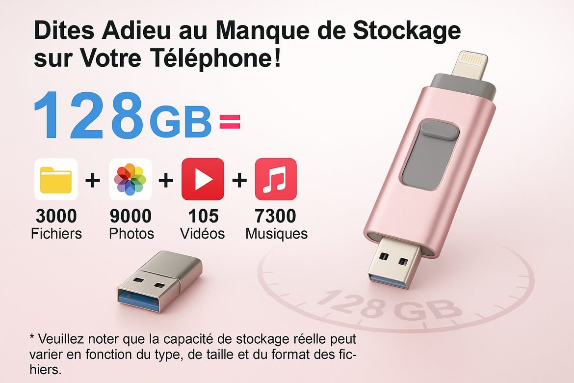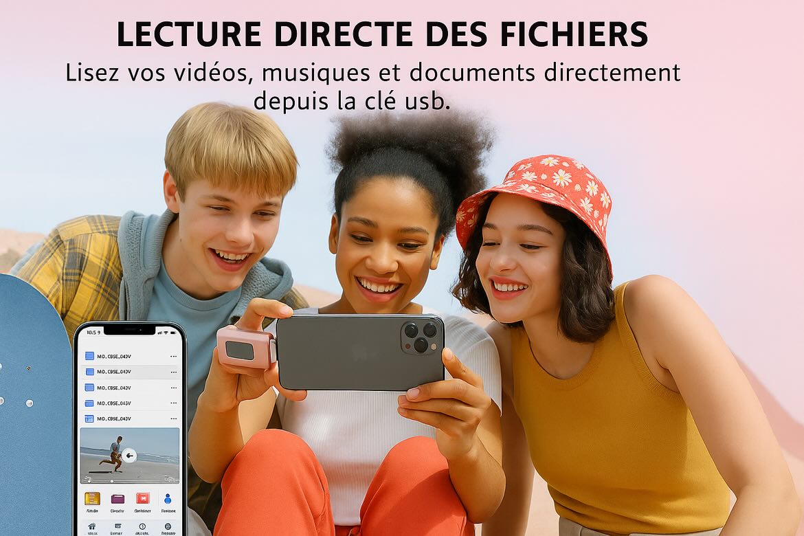 Oui ! Il suffit de brancher la clé à votre iPhone et d’utiliser l’application dédiée (souvent gratuite et simple à utiliser). Vous pouvez lire photos, vidéos, musiques et documents directement depuis la clé, sans les transférer sur votre téléphone